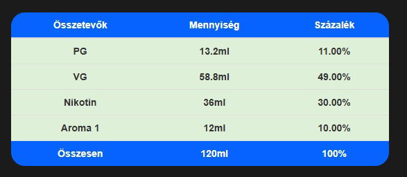 Ha jól számoltam a kalkulátorral 70VG-30PG 6mg/ml 10% arányos keverés