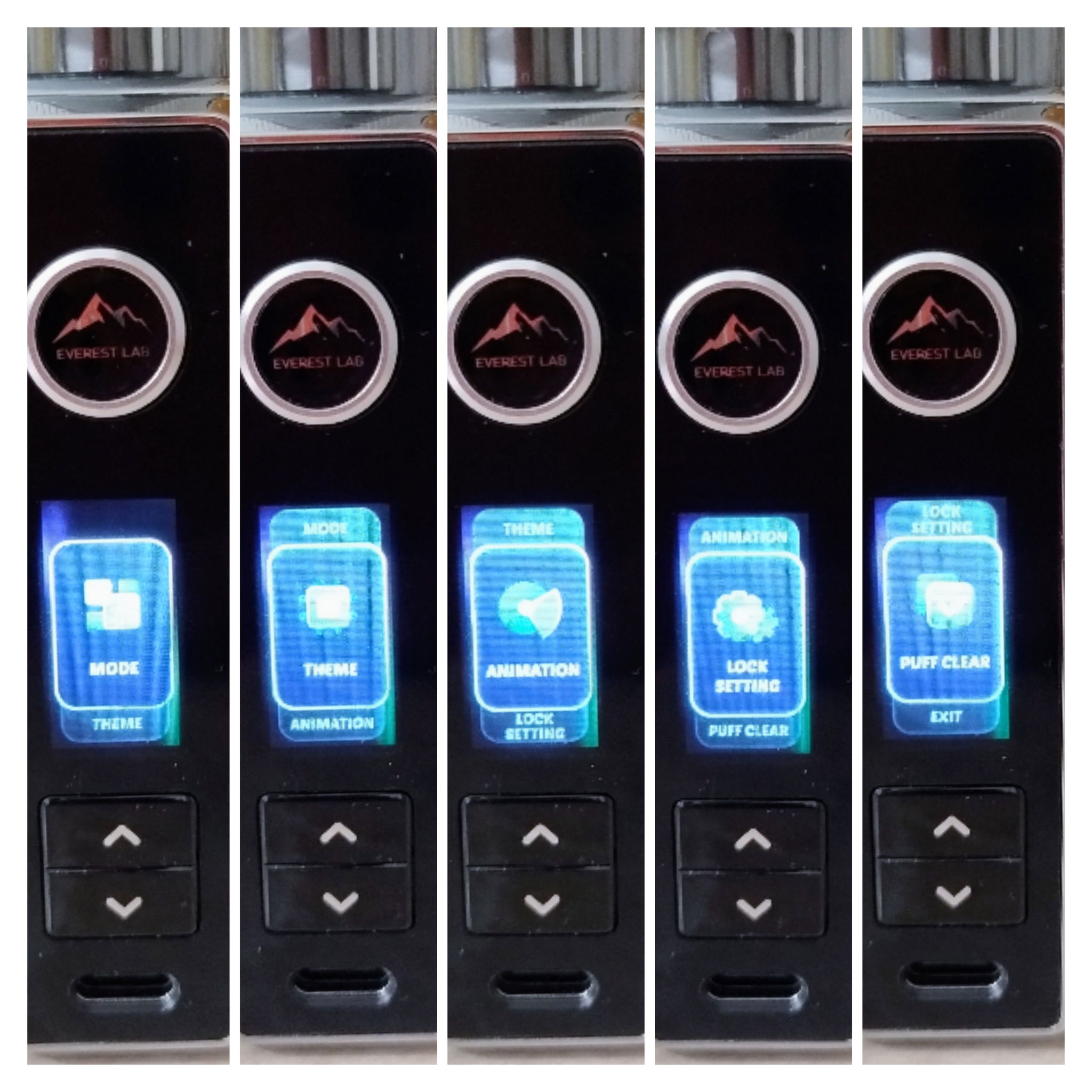 Ezt sem vitték túlzásba. 5db menüpontot kapunk amiket 3 gyors tűzgomb nyomással érhetünk el. Ezek a Mode, Theme, Animation, Lock settings és a Puff clear. Picit visszakanyarodva a kijelző fikázásához: Fotózhatatlan…
